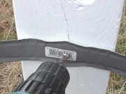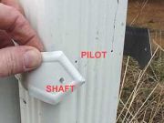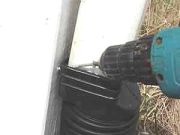 Step 11: Two holes are required in the strap and the downspout. Drill a larger (shaft) hole in the strap and a smaller pilot hole in the downspout. |