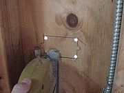 Step 11: You'll need to drill through sill plates using 5/8" speed bit drill. In this how-to, we have chosen to use armored or BX rather than Romex cable and metal boxes for a good secure weathertight fit. If you use BX cable, don't forget the anti-short or insulated bushing. If you have part of the cable exposed to sunlight (such as below the siding along the foundation), make sure that you use UF/sunlight rated cable. You may also need to use conduit. Check with your building codes as standard two wire may not be enough and three wire may be needed. |